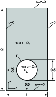 The initial configuration, see the figure below, is identical for both test cases and consists of a circular bubble of radius r0 = 0.25 centered at (x,y) = (0.5, 0.5) in a 1 by 2 rectangular domain. The density of the bubble is smaller than that of the surrounding fluid (ρ2<ρ1). The no-slip boundary condition (u = 0) is used at the top and bottom boundaries, whereas the free slip condition (,